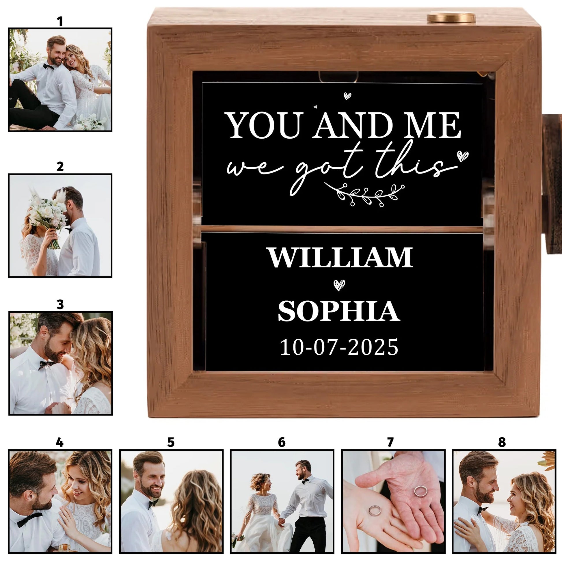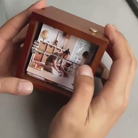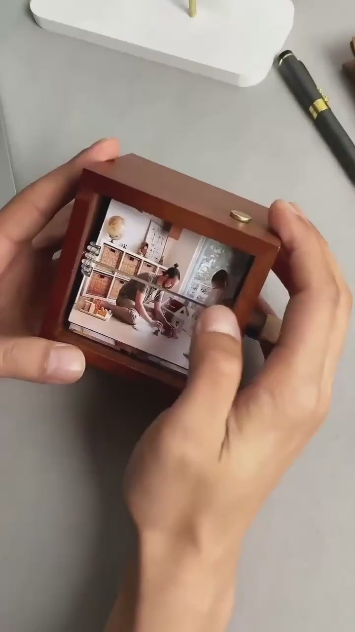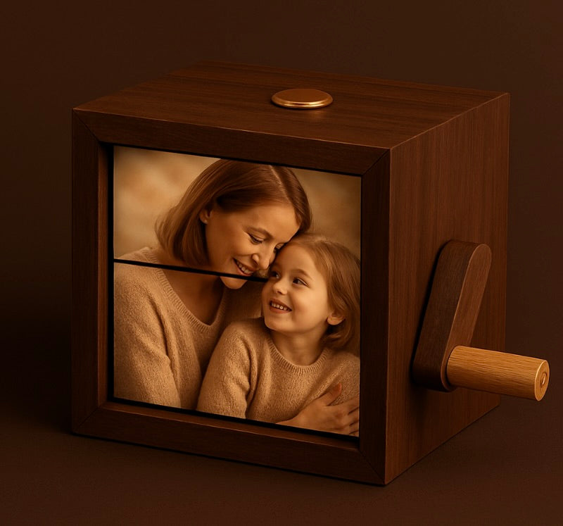 O cutie elegantă din lemn, în care pozele se rotesc una câte una, transformând amintirile tale într-un mic spectacol. Nu este doar o cutiuță cu poze, ci o adevărată mașină a timpului pentru amintirile tale. Cu fiecare rotire a manivelei, poveștile tale prind viață din nou, răsfoind cele mai frumoase momente, așezate elegant într-o cutie din lemn lucrată manual.